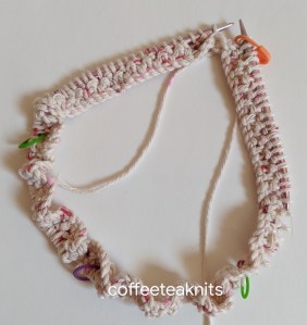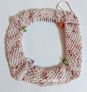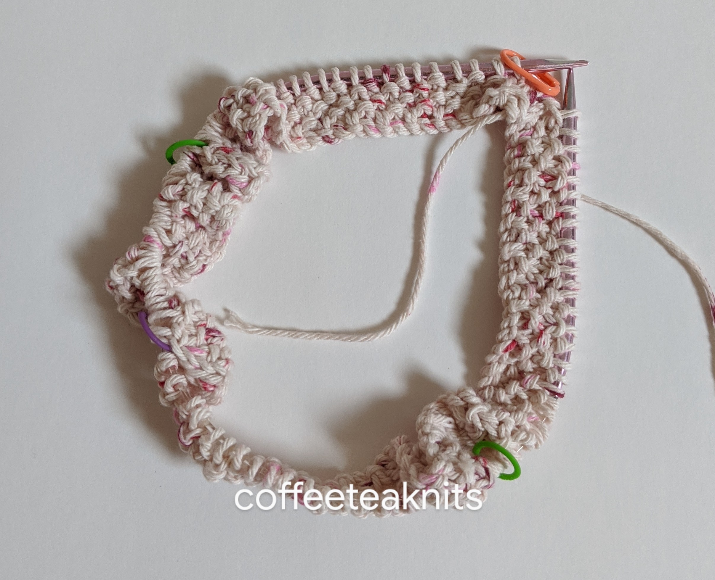 • Round 2: K1, knit in seed stitch pattern till 1 stitch before first maker, K1, sm, K1, knit in seed stitch pattern till 1 stitch before second marker, K1, sm, K1, knit in seed stitch pattern till 1 stitch before third marker, K1, sm, K1, knit knit in seed stitch pattern till 1 stitch before BOR marker, K1, slip BOR marker.