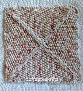 This mitered dishcloth is knitted in the round from the cast on edge, and then through a series of decreases moves towards the center. The seed stitch pattern is similar to the previous dishcloth pattern (July 2020 post) except that this one is knitted in the round and has four smaller mitered squares that merge in the center.
