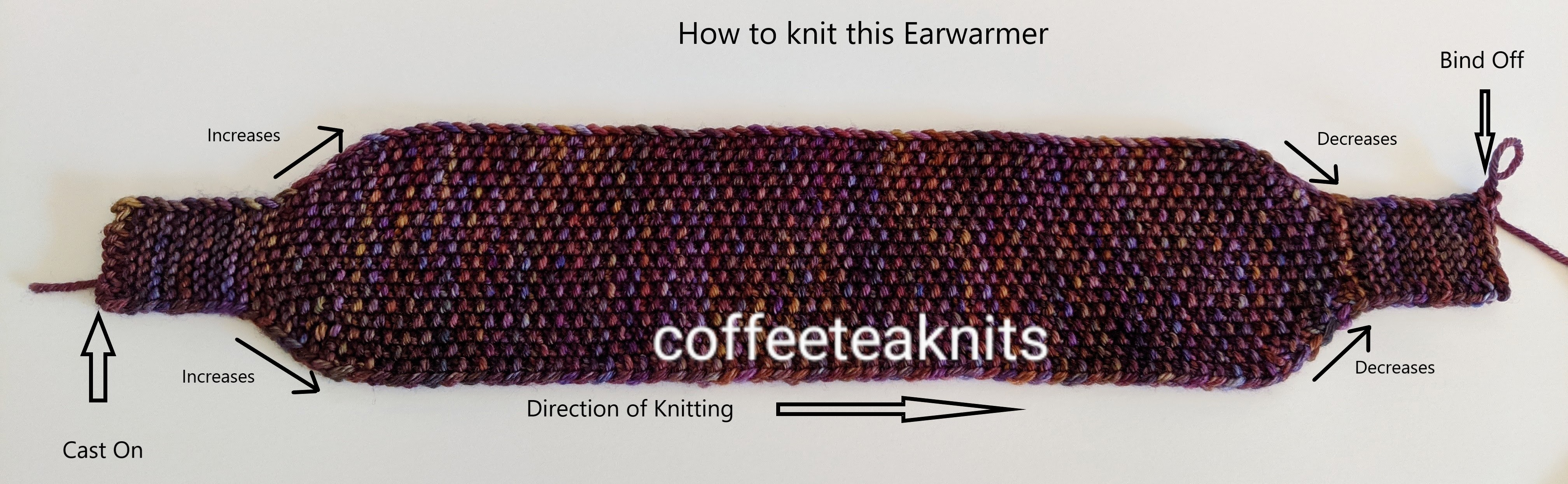 It is first knit in garter stitch pattern for a couple of inches, then increased by 2 stitches every other row for another inch or so (customizable) in seed stitch pattern. The earwarmer is knit straight in seed stitch pattern with no increases or decreases for a specific (customizable) length, and then decreased every other row to the original number of stitches. It is knit again in garter stitch for a couple of inches and then bound off. The two garter stitch sides are joined using the zig zag crochet method.