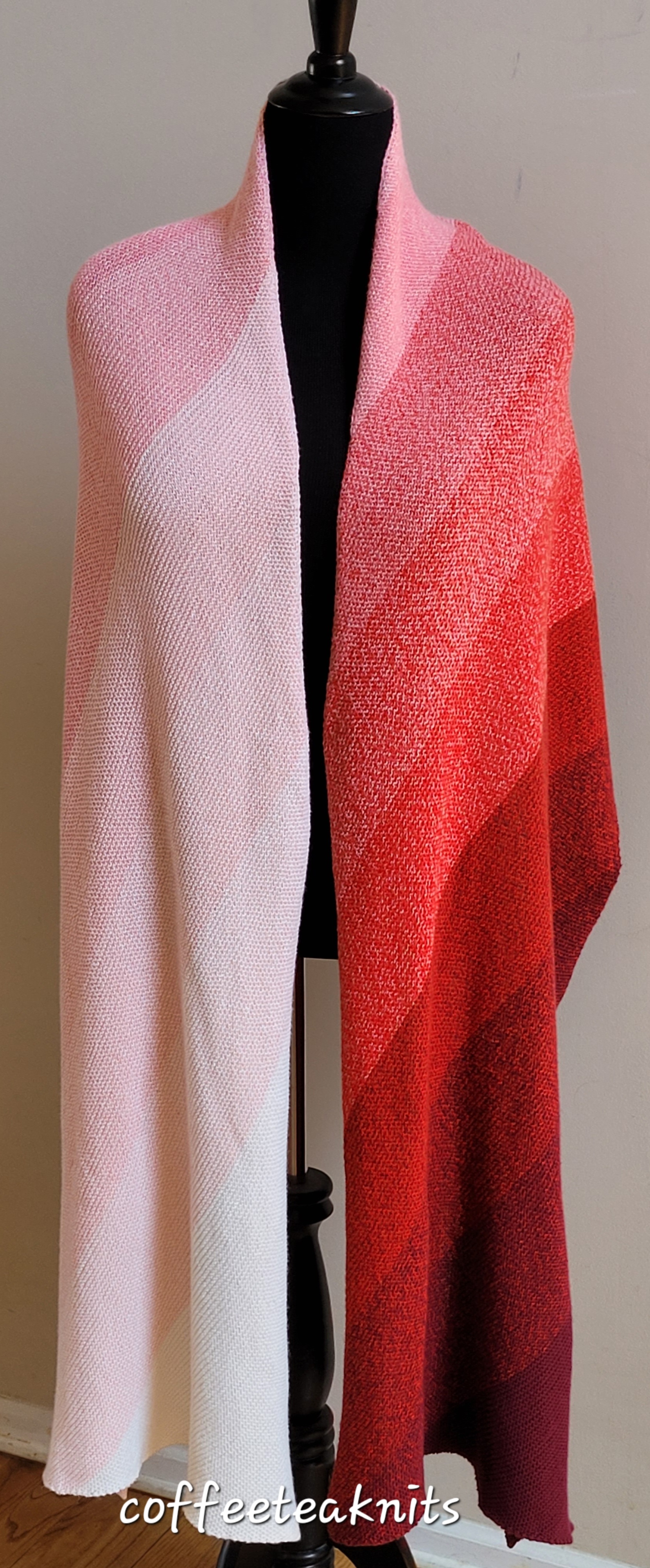 The Nostalgic Wrap is knit using the same cotton yarn as in The Harmony Wrap that I knit in September 2020. The colors of the yarn are different in the two wraps but each cake of this yarn has a gradient of 14 different colors. The yarn has been discontinued but a substitute yarn can be found on Yarn Sub. Both wraps are knit using the bias knitting technique with a 1 stitch cast on (tutorials for bias knitting technique can be found on YouTube). The wrap is knit using the garter stitch pattern. Although knitting the Nostalgic Wrap took a long time, I found it both a very relaxing and meditative knit. The wrap can be easily customized to shorter length or wider width if preferred. The Nostalgic Wrap is about 18 inches wide (without stretching) and about 96 inches in length.