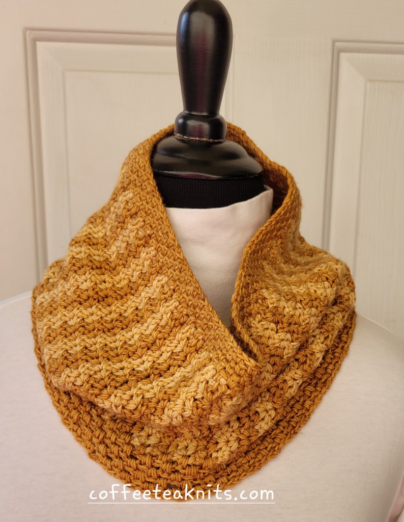 This year at the New Jersey Sheep and Fiber Festival, I was happy to see Marian of the Marianted Yarns since it was her last time vending there. A few years ago, I bought a Practicality 75/25 (superwash merino/nylon) fingering weight skein in the Beeswax colorway from her. I wanted another skein in that colorway this year, but it was unavailable. Instead, I chose the Honeycomb colorway and purchased it. Both colors remind me of the autumn leaves in my yard. I will miss Marianated Yarns next year, but the Autumn Leaves Cowl will help me remember this wonderful day at the festival.