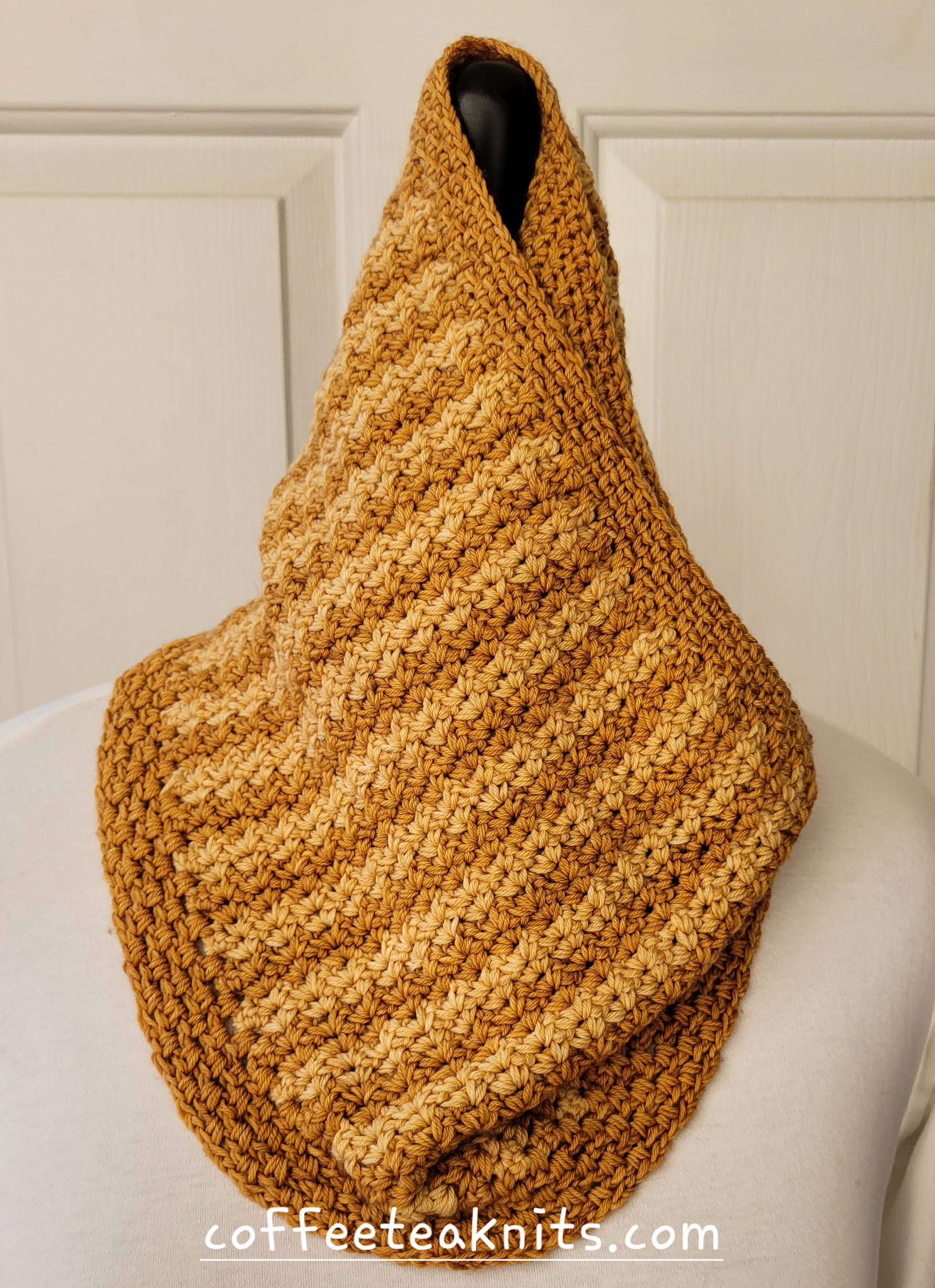 The Autumn Leaves Cowl is crocheted back and forth, holding two strands of the same colorway of yarn together. The single crochet V stitch pattern is repeated several times, with alternating colorways every 2 rows. A row of crochet moss stitch is made from the right side to the left. This helps flatten the bump from the V stitch cluster. A row of crochet moss stitch is also made on the foundation chain edge, starting at the slip knot stitch. The 2 edges are then joined using the crochet zig-zag join method. Lastly, the Autumn Leaves Cowl is completed with a crochet moss stitch border. This border is on both the top and bottom edges of the cowl.