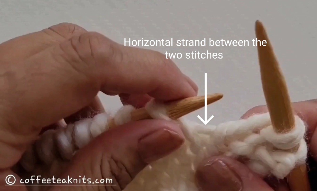 The horizontal strand between the stitch just worked on the right knitting needle and the stitch on the left knitting needle is lifted and placed on the left knitting needle. The loop made by the horizontal strand on the left knitting needle is then knit to create an extra stitch.