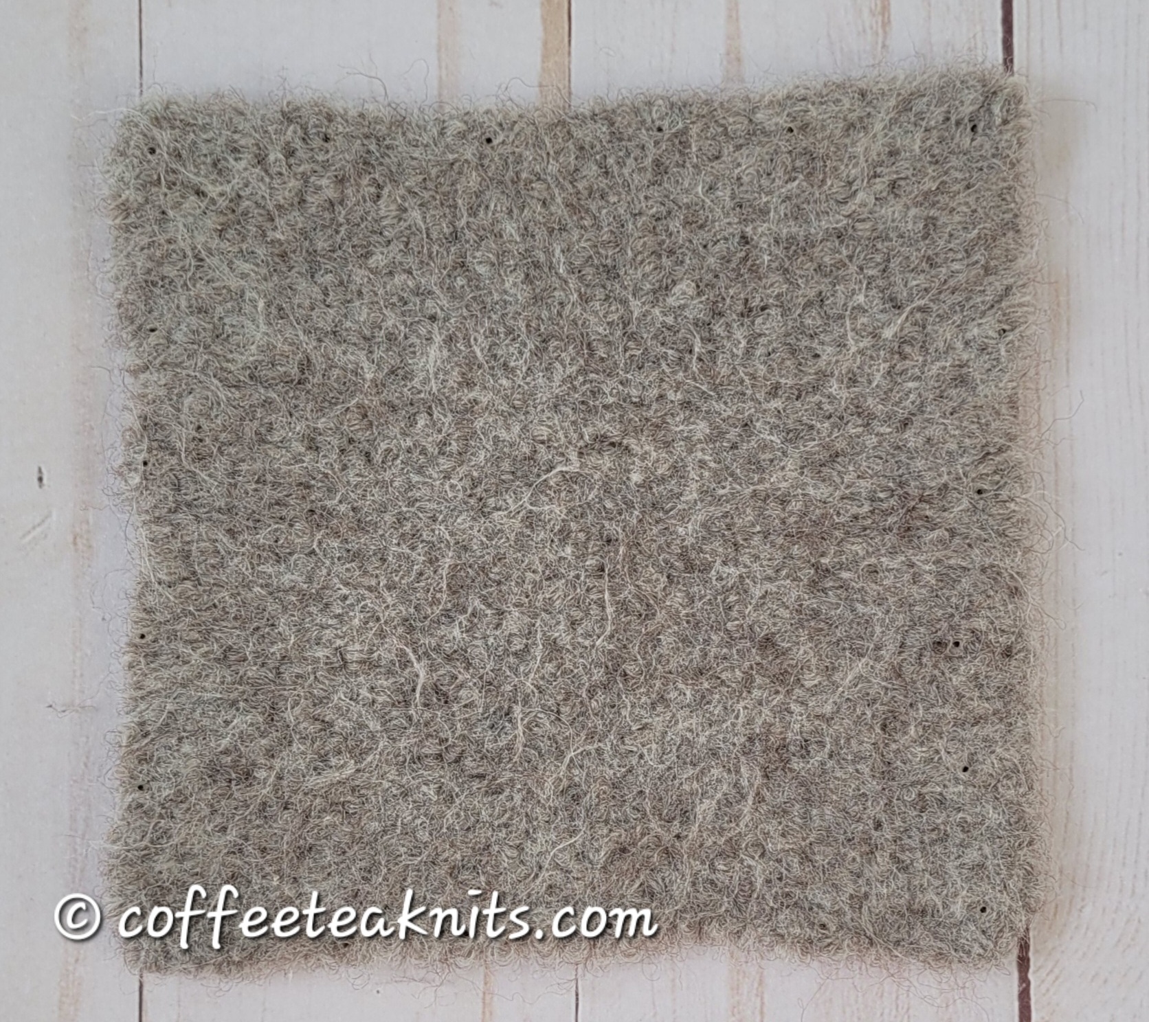 The dimensions of the Felted Potholder is 5 x 5 inches. It is dense, rustic with fibers that stick out and has no stitch definition
