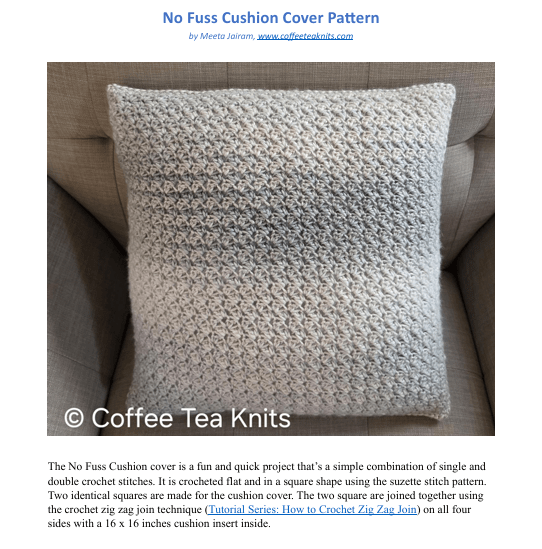 - Step by step written instructions to crochet the No Fuss Cushion Cover