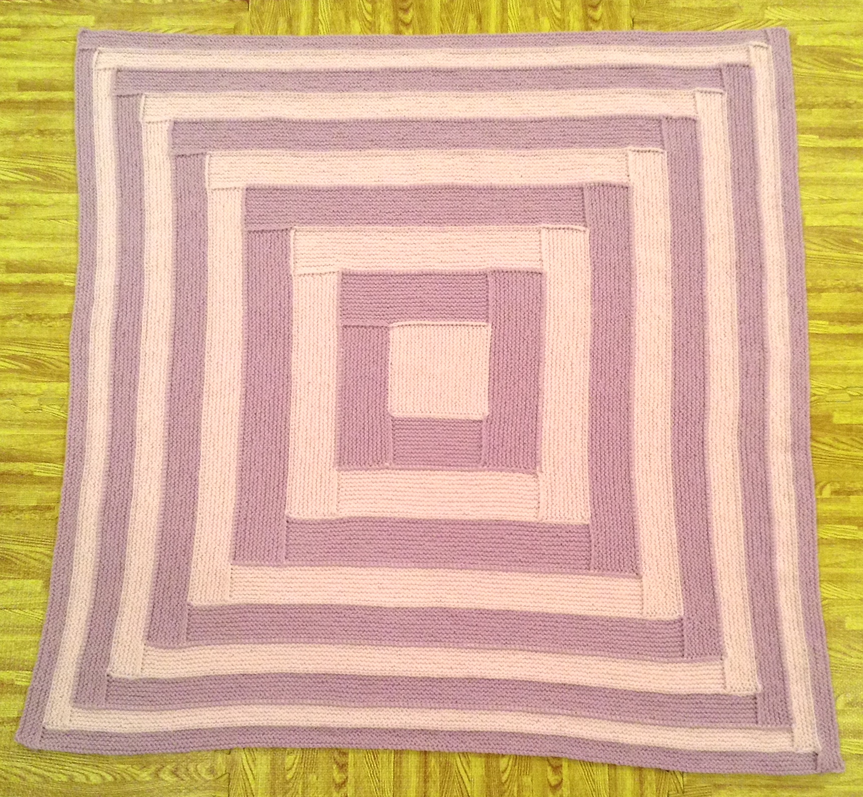 This blanket is a modified version of the log cabin scrap blanket pattern. I knit this using garter stitch and two colors only. The center square is knit first. With the last stitch remaining on the needle after bind off, the piece is rotated to one side and stitches are picked up and knitted. This process is then continued for all sides. I kept the garter stitch pattern so I could knit while I watched TV. One side of this blanket is smooth while the other side shows the ridges of the picked up stitches. I like the pattern the ridges form. Yarn used: Lion Brand Pound of Love in pastel pink and lilac.