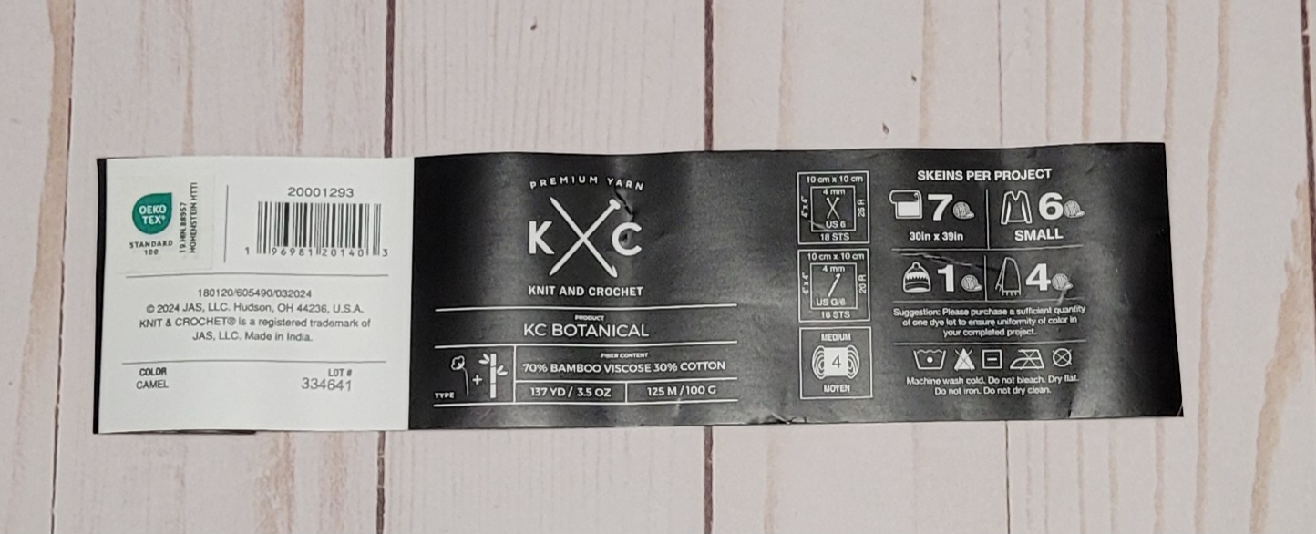 Materials Needed: Yarn: KC Botanical by K+C Yarn in the Camel colorway (2 skeins used for the scarf). An image of the yarn label with more information is shown below