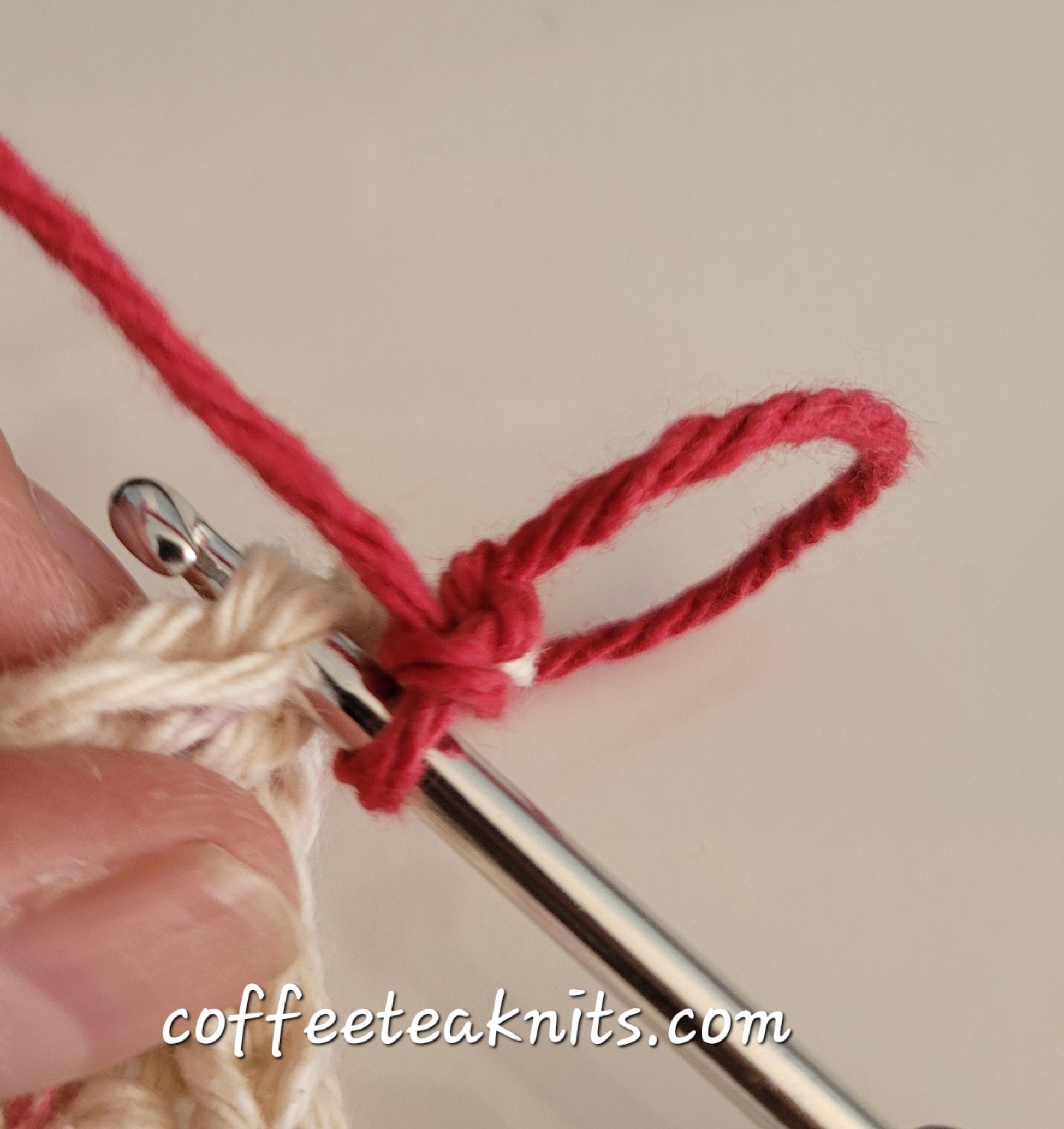 With Yarn 2 make a slip knot (How to Slip Knot) and place the loop onto the US #G-6 (4.0 mm) crochet hook. Insert the slip knot loop through the remaining stitch on the crochet hook and chain 1 (beginning of round)