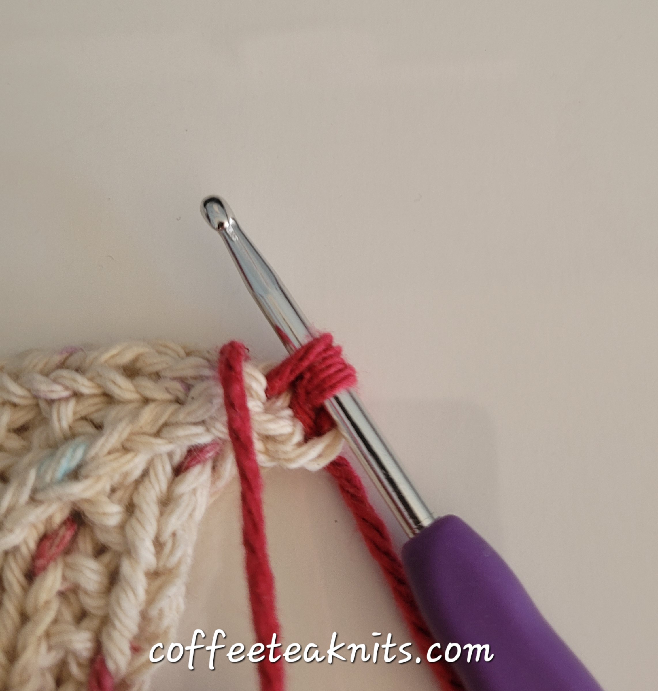 At the corner stitch of Side 1, make 2 wrapped single crochet stitches. Then turn to the first cast on edge stitches (Side 2). Repeat Steps 1 to 3 all along Side 2 until you reach the corner stitch