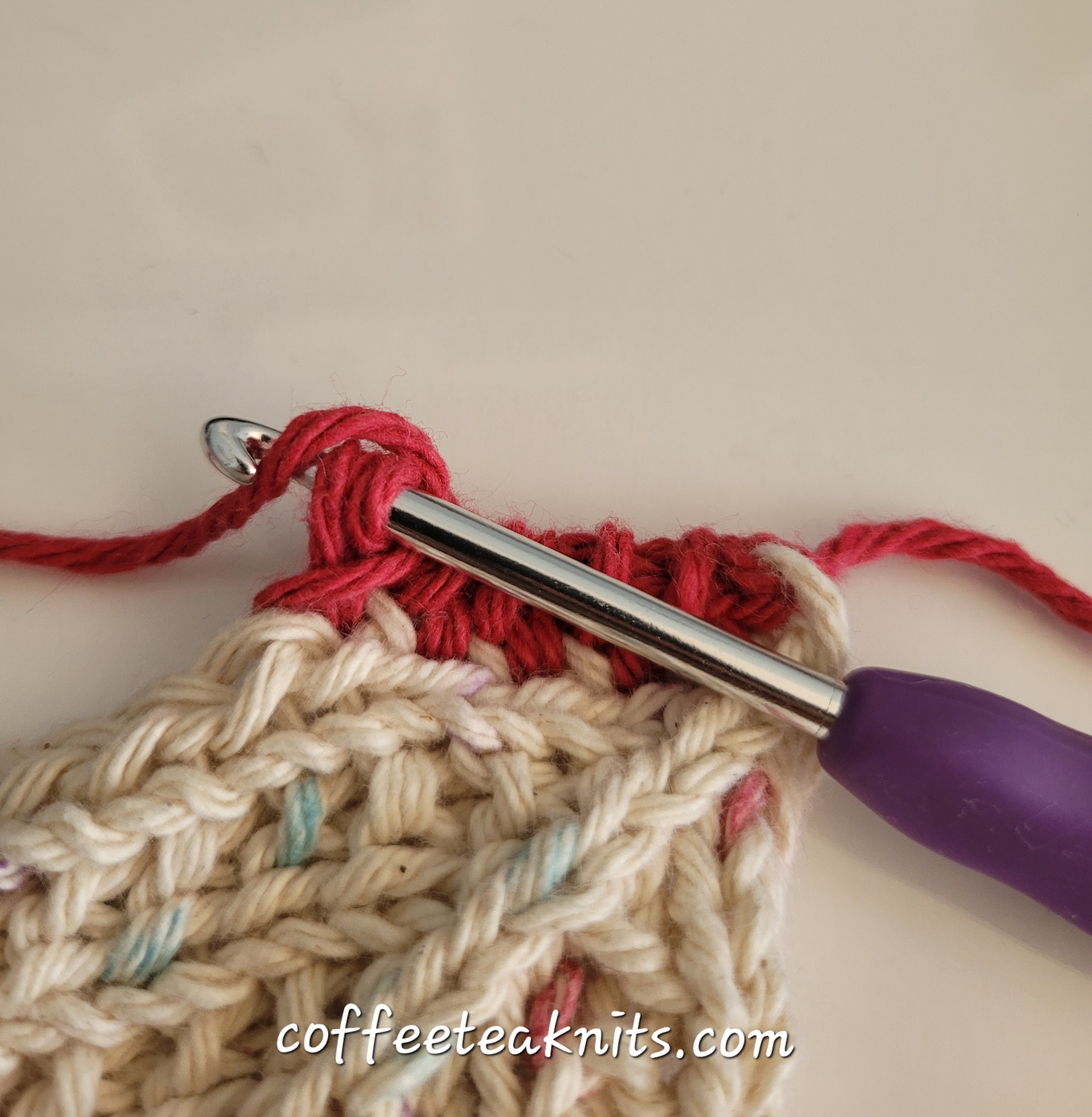 Step 3: Yarn over with the working yarn and pull though the 2 loops on the crochet hook as in single crochet (see images below of the worked stitches Side 1 of the dishcloth)