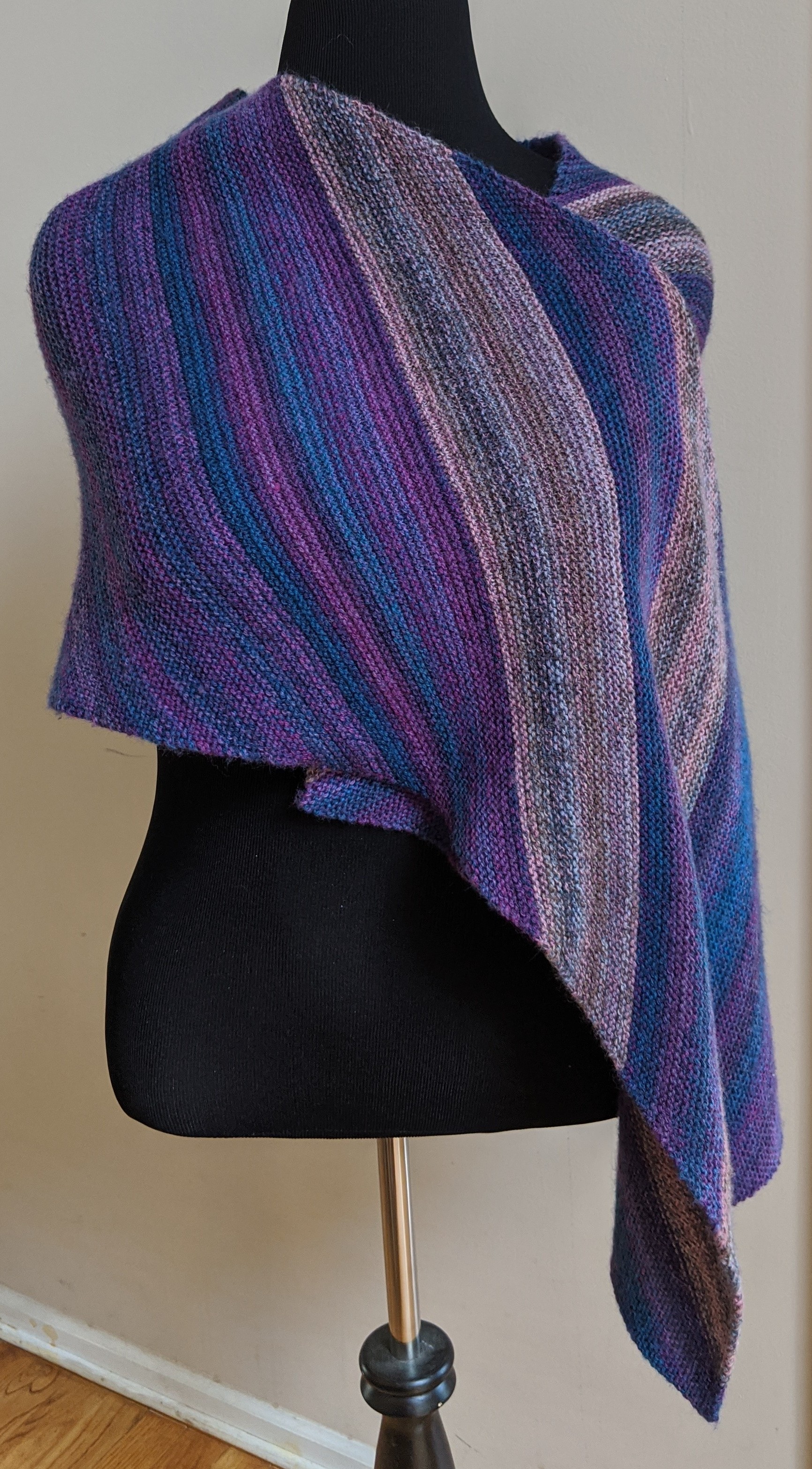 I used the Zaden Spring Shawl pattern by Staci Perry of Very Pink Knits as inspiration and also to learn the bias knitting technique for a wrap. I modified the pattern by using a different stitch count, sock yarn, and knit the wrap using just the garter stitch pattern.