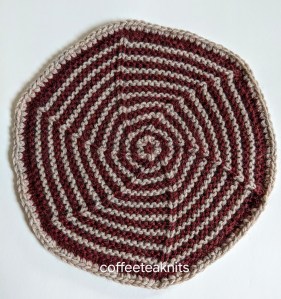 I knitted this Striped Spiral Hotpad/Trivet in the round with a series of decreases in a spiral towards the center. The trivet is knitted in the garter stitch pattern with 2 strands of yarn held together. The stripes in the trivet are made by alternating the two different yarn colorways for each garter ridge. I used yarn I already had in my stash from previous leftover projects so all the colorways may or may not be currently available. You can use any other yarn colorway to knit this trivet.