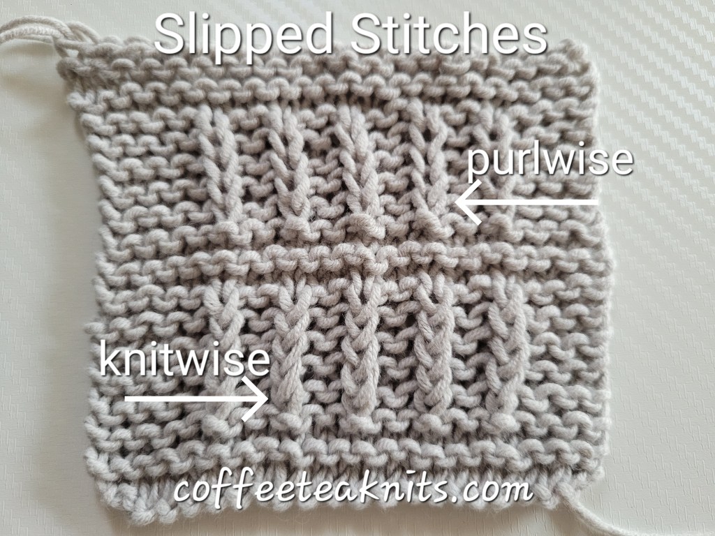 Slipped Stitches are stitches that have not been worked (knitted or purled) with the working yarn. These stitches are just transferred from the left knitting needle to the right knitting needle. The stitches can be slipped to the right knitting needle either knitwise or purlwise. A knit pattern will usually specify how the stitches are to be slipped. Otherwise the default is to slip stitches purlwise. Below is a garter stitch sample with stitches slipped either knitwise or purlwise on the right side. These slipped stitches are then purled on the wrong side of the work. There is some difference in how the stitches look when slipped knitwise versus when they are slipped purlwise.
