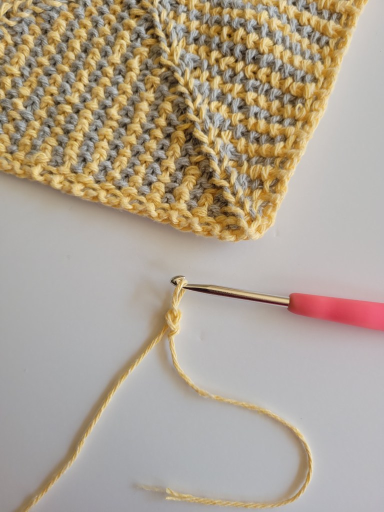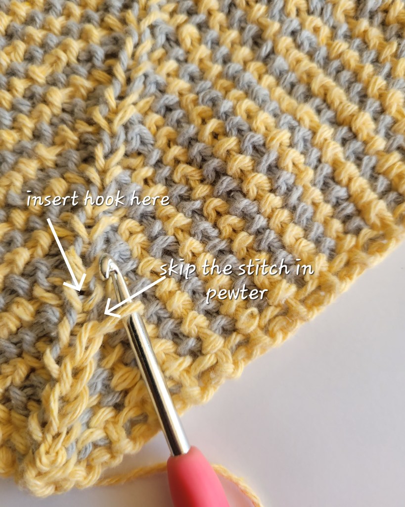Insert the hook for the duplicate crochet stitch in the colorway 1 (yellow) knit stitch and skip the colorway 2 (pewter) knit stitch. Continue with the duplicate crochet stitch till you reach the center, break yarn and pull it through the last stitch.
